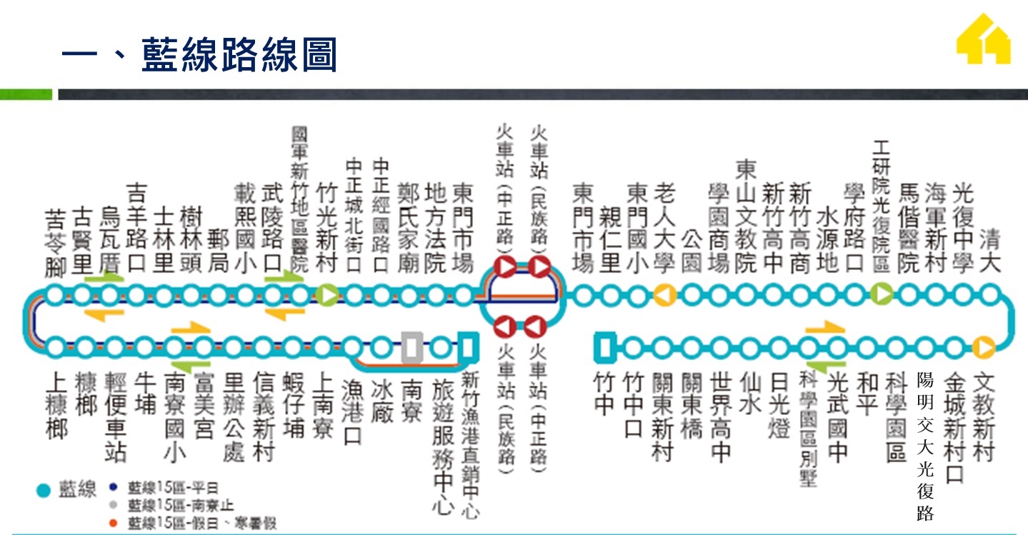 ◎【藍線】主線以既有1路、15路動線銜接整併為主,提供南寮往返竹中便捷公車服務,【藍線1區】、【藍線15區】則分別維持1路、15路行駛動線作為【藍線】區間線,提供火車站往返南寮及竹中之公車服務。