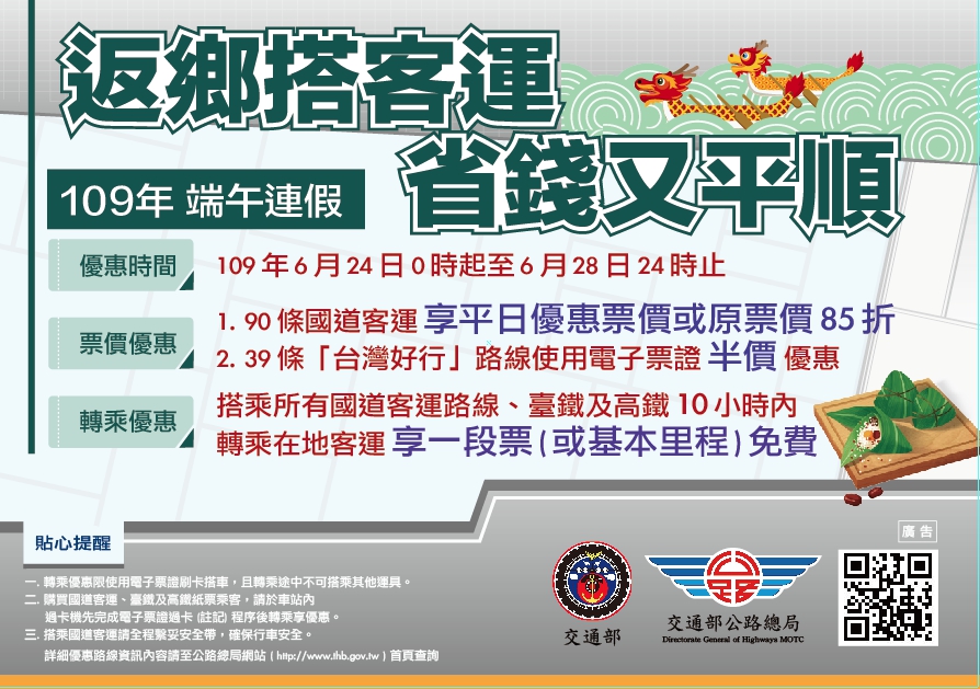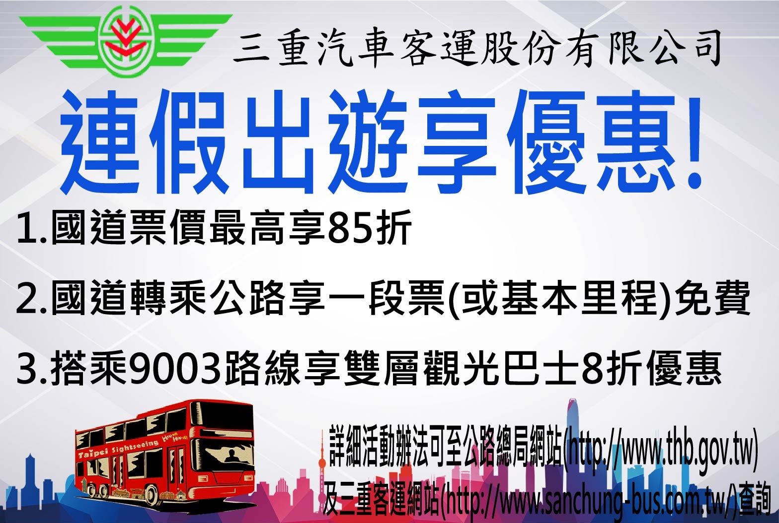 109年中秋暨國慶連假(9月30日~10月4日及10月8日~10月11日間)搭乘國道客運及「台灣好行」享票價折扣優惠;另搭乘國道客運、臺鐵及高鐵享轉乘在地客運優惠,詳細優惠資訊,請至公路總局網站查詢,謝謝!