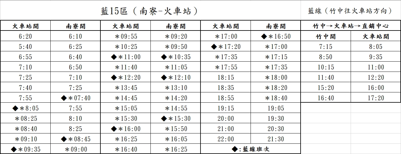主旨:因應業務需要(符合兩個工作日之間休息工時規定),本公司新竹市區公車藍15區、藍線班次時刻調整,詳如說明,不便之處敬請見諒。