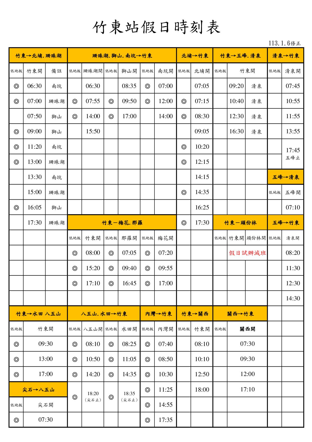 本公司竹東地區駕駛人力嚴重不足,為符合駕駛員駕車時間管理規定,自113年1月6日(星期六)起調整【5630】假日發車時間,另試辦【5628】及【5635】假日減班,不便之處,尚請見諒。