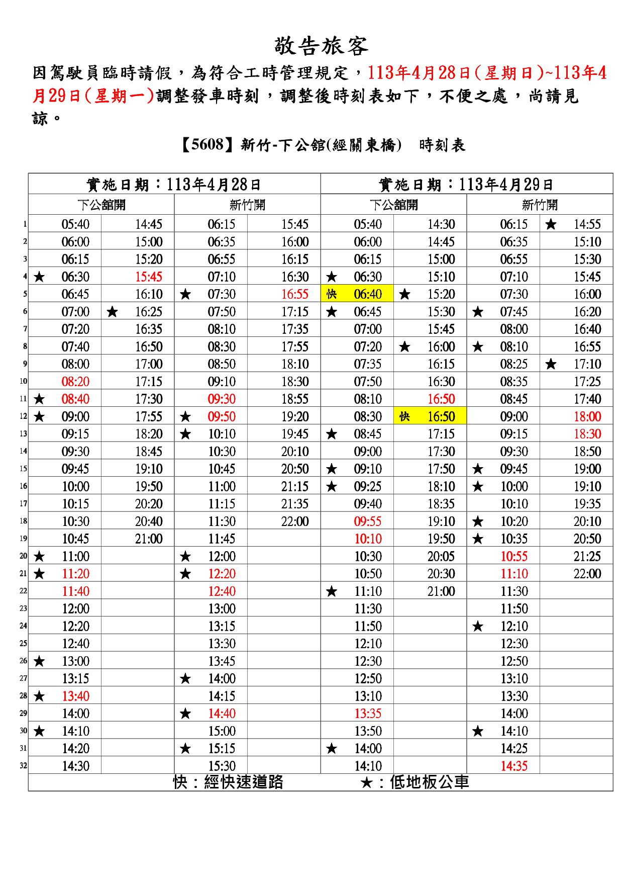 因駕駛員臨時請假,為符合工時管理規定,113年4月28日(星期日)~113年4月29日(星期一)臨時調整【5608】新竹-下公館(經關東橋)路線發車時刻,調整後發車時刻如附件,不便之處,尚請見諒。