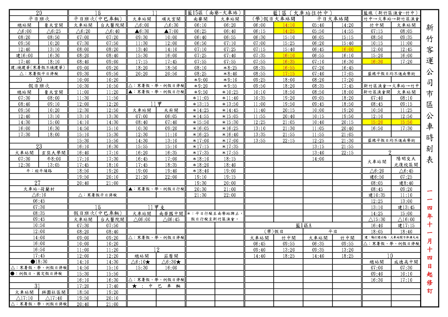本公司為提升班次準點率,自114年11月14日(星期五)起調整新竹市【藍線】及【藍1區】市區公車路線部份班次發車時間,詳細班次請參閱附件,不便之處,敬請見諒。